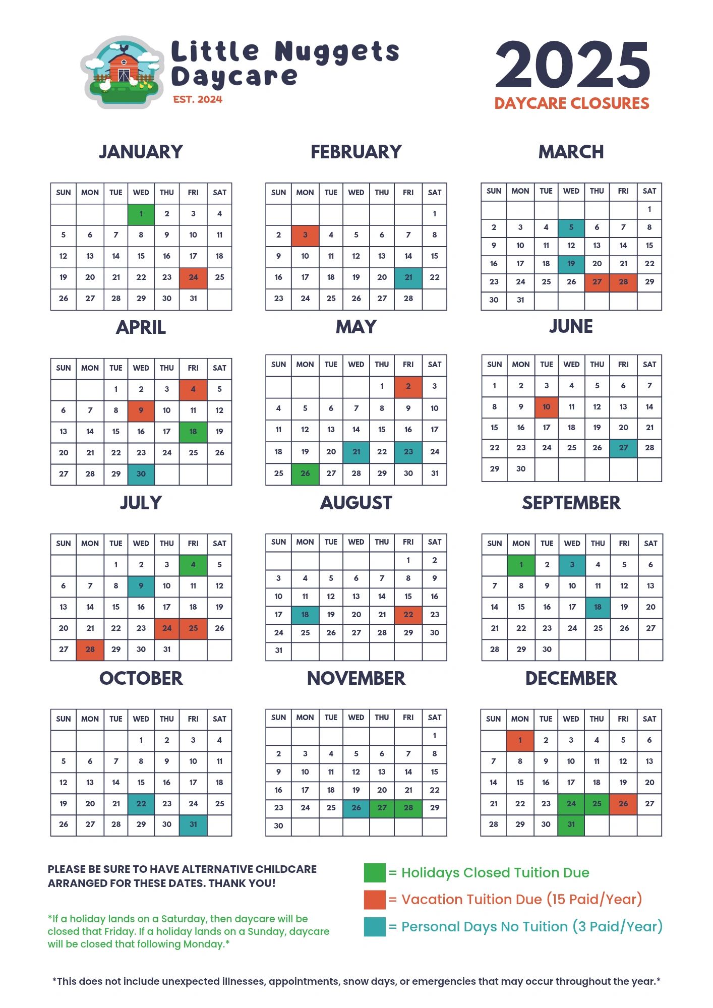 Please Note: This does not account for unexpected illnesses, appointments, snow days, or emergencies that may arise.